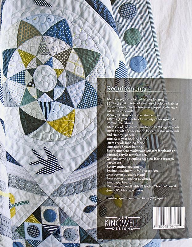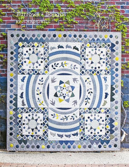 Jen's signature scrappy style is re-imagined in her newest project, Burrows and Boughs. Made exclusively from "Greenstone" (her fabric line with Moda) in which Jen combined a range of hues within a narrow palette of blues, greens, greys & a playful mix of prints. The result is sophisticated & refined with a touch of whimsy. Jen mixed techniques of machine, hand piecing and appliqué to create this hybrid sampler style / medallion quilt. 67" square.