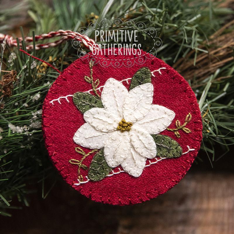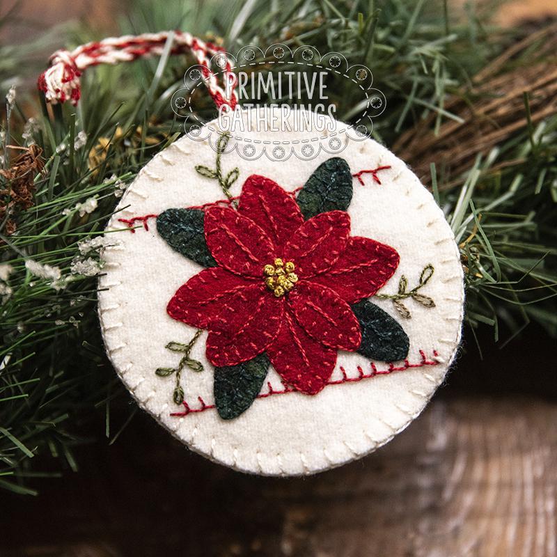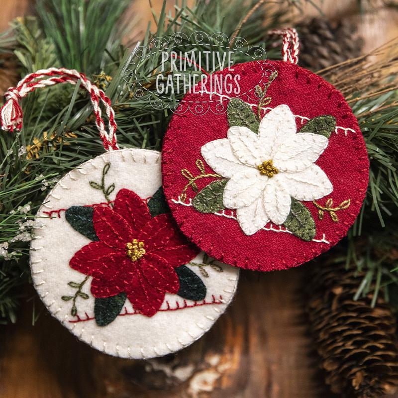 These charming wool appliqué ornaments add the perfect handmade touch to your holiday decorating. Each ornament features a beautifully layered poinsettia—one in classic red and one in crisp winter white—set against coordinating wool backgrounds with delicate stitched accents. Finished with a braided hanger, they’re ready to nestle into your tree, adorn a garland, or top off a festive gift.