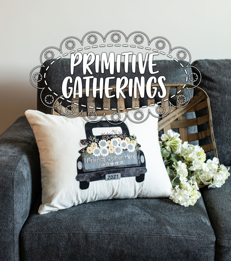 This fun wool applique project makes a great pillow or wall hanging. The old truck is symbolic of the one we have on the property here at Primitive Gatherings. The truck bed is overflowing with flowers. Finished size is 16"x20" for the pillow.