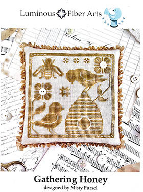 Cross stitch pattern from Luminous Fiber Arts featuring birds resting on a beehive while a bee collects honey!