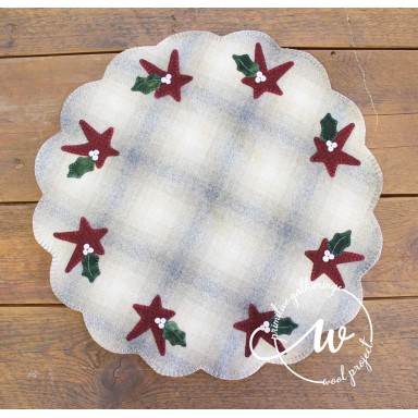 A wool appliqué holiday table mat or tree skirt, features a star and holly leaf with berries. A wool background is used. 2/3yd of homespun backing is recommended. Finished size is 22" x 22".