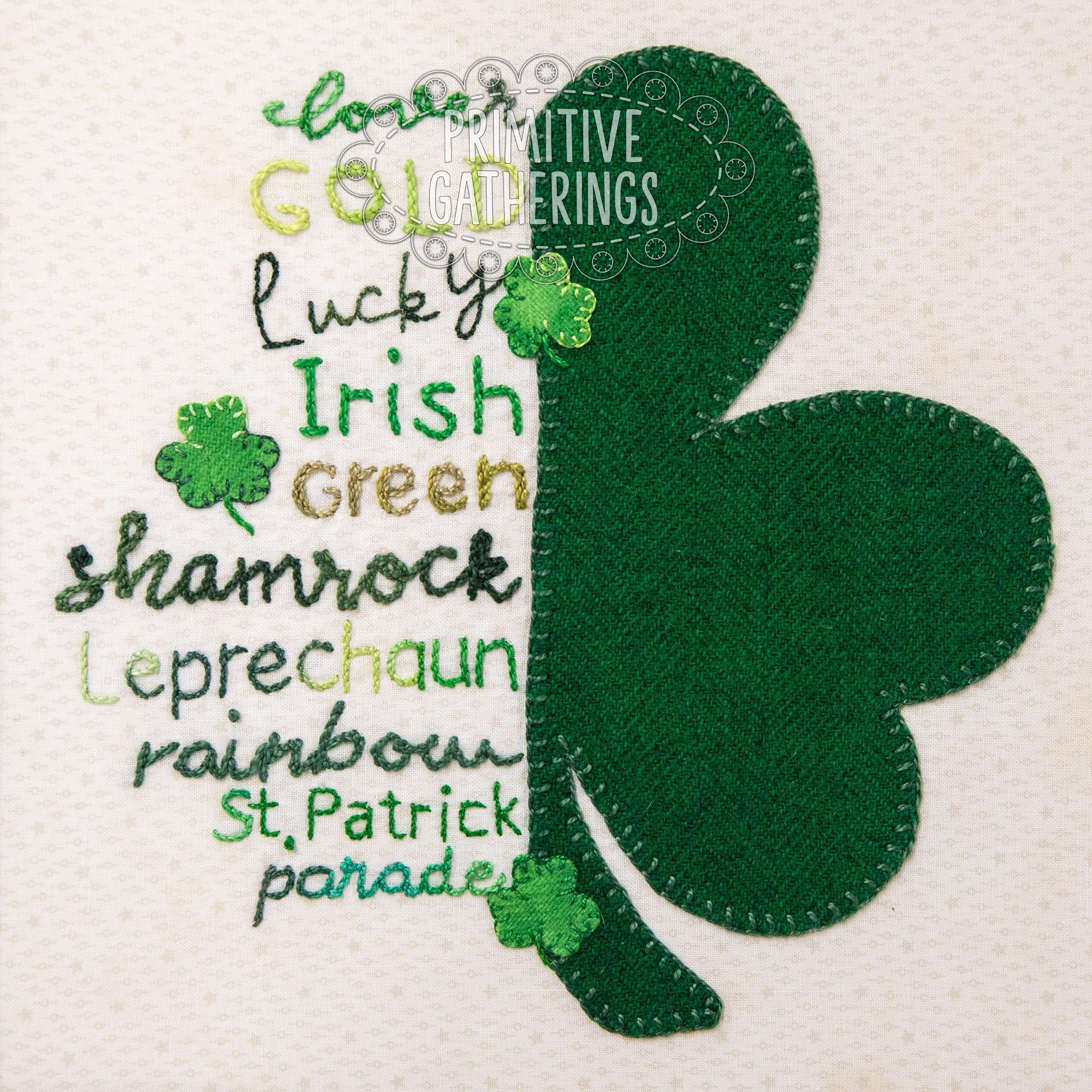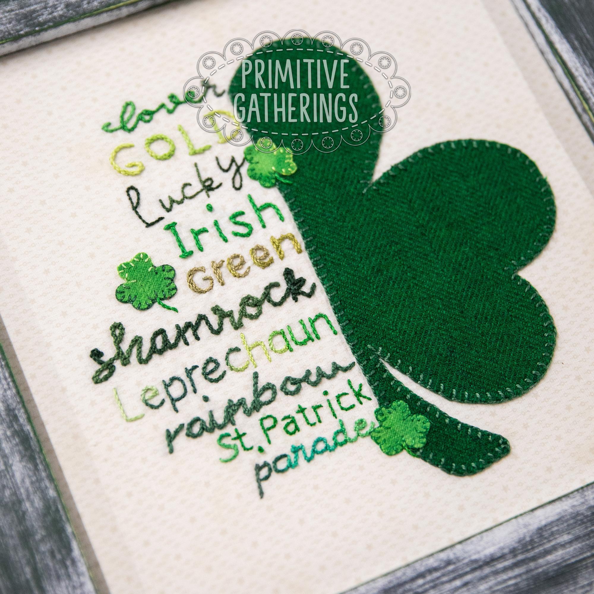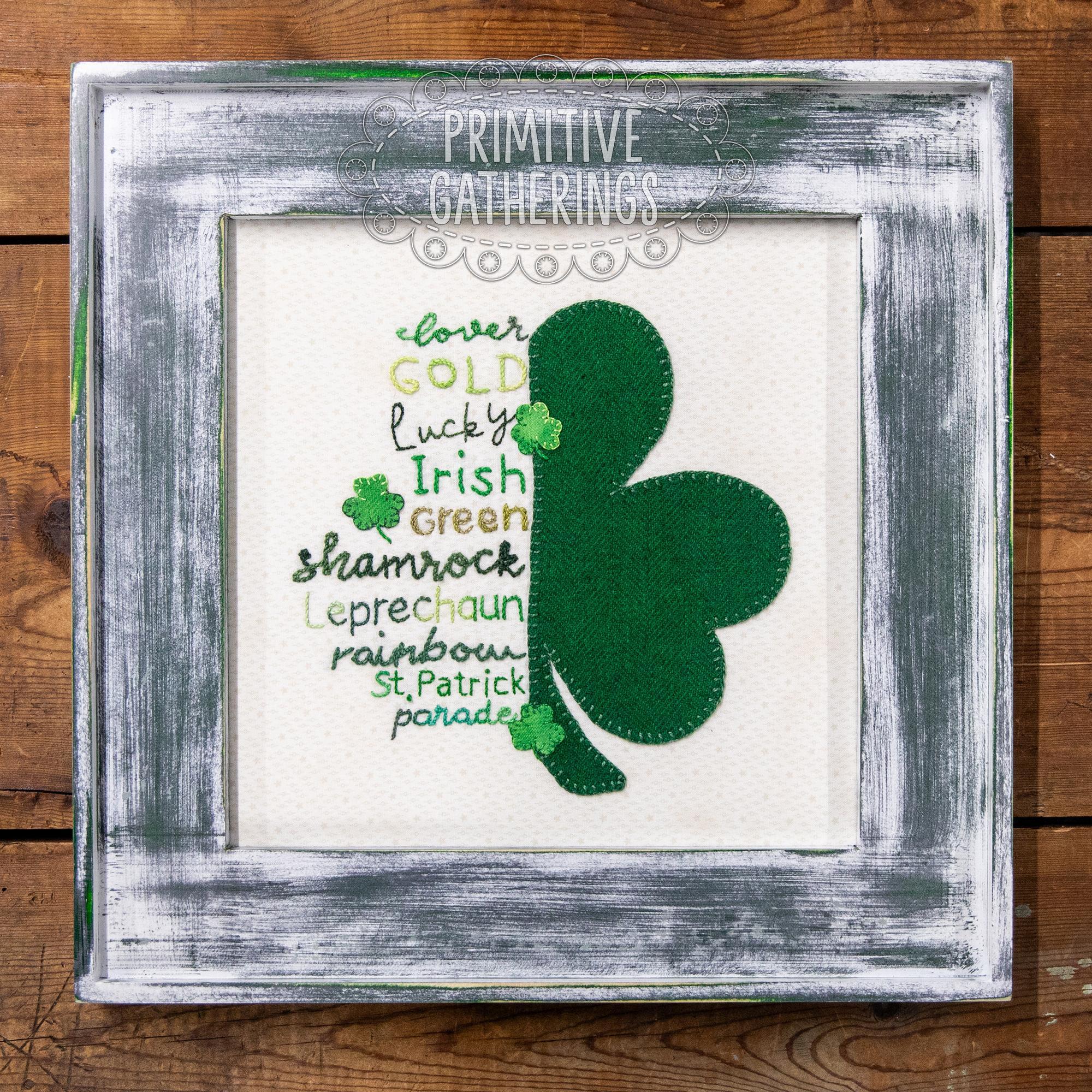 This framed piece consists of half of a shamrock, stitched on a cotton background. To the left of the shamrock are hand-stitched words in classic block or cursive script, each one associated with St. Patrick's Day! Perfect for adding a touch of handcrafted whimsy to your holiday decor!!