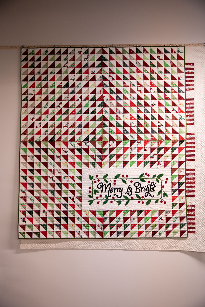 This is a very festive half square triangle quilt that is dressed up with some wool appliqué. Our Merry & Bright quilt will finish at 60" x 70". You will need 4 yards of fabric for the backing....and we used 2 1/2" triangle papers, which we have available on our website.