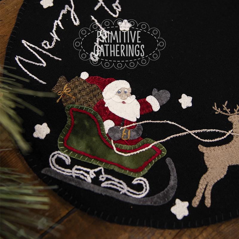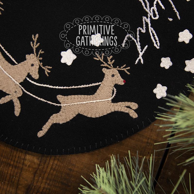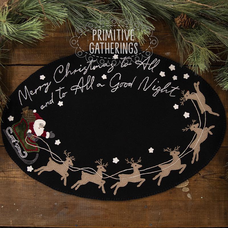 This stunning wool appliqué mat brings the magic of Christmas Eve to life. Set against a rich black background, Santa and his sleigh swoop across the night sky, led by eight beautifully stitched reindeer in soft, warm wool tones. The whimsical embroidered script—“Merry Christmas to All and to All a Good Night”—arches gracefully across the top, adding storybook charm to the entire piece.