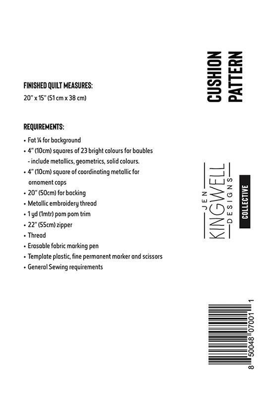 Product Description Project Size: 20" x 15" Create some vintage Christmas charm with this fun applique bauble cushion. Use gorgeous bright and metallic fabrics and thread to make it sparkle and finish with some festive pom pom trim.