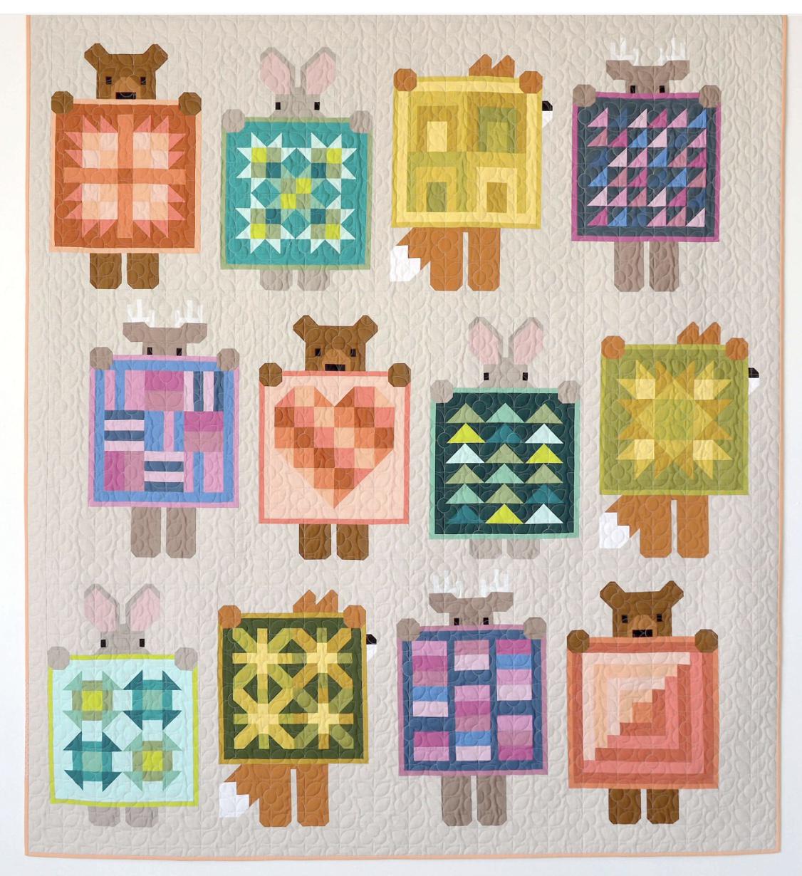 These forest friends are excited to show off their latest finishes at tonight's guild meeting! The fat quarter-friendly pattern includes instructions for making three quilt sizes including 4 different animals (foxes, bunnies, deer, and bears) and their 12 different patchwork quilts. 75x85