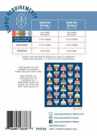 Snow Day is a fat quarter friendly, traditionally pieced quilt recommended for the intermediate sewist & up! The pattern includes instructions for making two throw size options that both measure 66" x 78". The pattern consists of a Beanie block (10 1/2" square) and Scarf block (10 1/2" x 22 1/2") that are arranged randomly throughout the quilt. The 19-page pattern includes an optional FPP pattern for the brim of the beanie, tags for organizing your cuts of fabric, downloadable coloring pages, detailed instructions, and colorful diagrams.