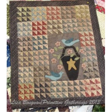 This sweet little quilt was made using 3/4" triangles. The off center large block uses wool appliqué to bring a couple feathered friends to life. Our sample was sprayed with our "Instant Antique" to give it a worn and loved look. Finished size is 13 1/4" x15 1/2". Look for our 3/4" triangle paper to use with this project.