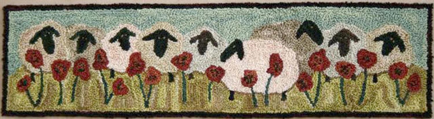 This charming piece measures 10-3/4 inches by 3 inches and features a delightful scene printed on weaver's cloth. The artwork captures a pastoral landscape with a row of black sheep standing amidst vibrant red poppies, set against a serene sky. The sheep are depicted with simple, stylized forms, their black wool contrasting beautifully with the colorful flowers and the soft, pastel background. The design brings a touch of rustic charm and tranquility, making it a perfect addition for both home decor and as a thoughtful gift.