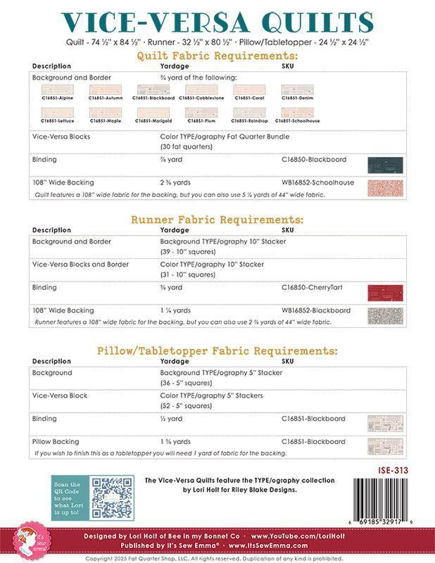 The Vice-Versa Quilt Pattern by Lori Holt of Bee in My Bonnet showcases a sawtooth star block, creating an engaging contrast between the background and print fabrics. In this design, the background can be the focal point, or the print can take center stage-Vice Versa! The pattern offers three design options: a twin quilt, a runner, and a pillow/table topper. It features the TYPE/ography collection by Lori Holt for Riley Blake Designs. Finished Sizes: Quilt 74.5" x 84.5" / Runner 32.5" x 80.5" / Pillow/Tabletopper 24.5" x 24.5"