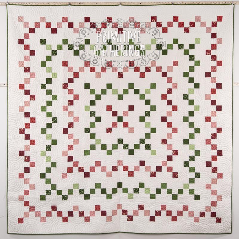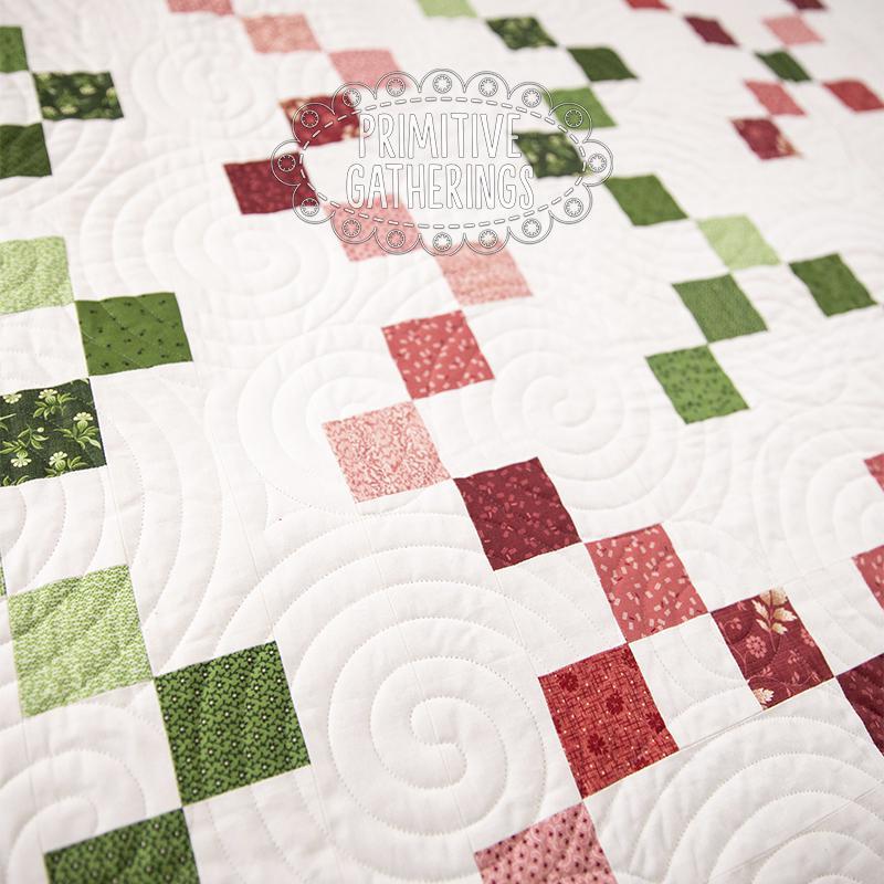 This striking 82" x 82" quilt brings fresh, festive charm to your holiday stitching. Designed with graceful chains of red and green squares dancing across a crisp white background, it creates a beautiful, almost ribbon-like movement throughout the quilt. The layout forms subtle wreath-like shapes and frames the entire piece with a lovely repeating border, giving it both elegance and playful holiday spirit.